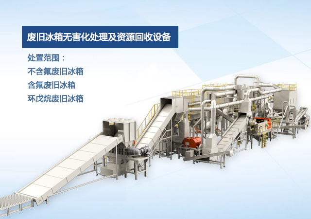 公司自主研發的廢舊冰箱無害化處理及資源回收技術及設備, 獨具 “雙軸撕碎機+立式破碎機+大風量稀釋環戊烷氣體”的專利組合設計, 主要用于對廢舊冰箱中的各種原材料進行分離、 回收和利用, 具有自主知識產權, 經國家工業和信息化部科技成果鑒定為 “填補國內空白, 達到國際先進水平” 。